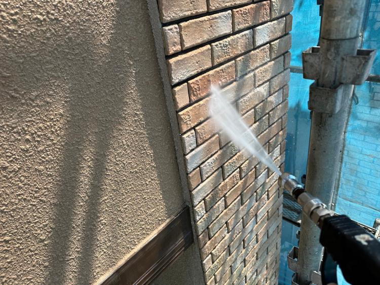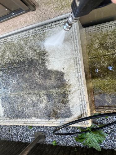 高圧洗浄機で表面にあるカビやコケ、ほこりなどの汚れを落としていきます。