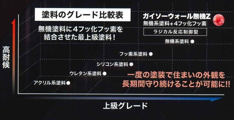 無機Zとは、最も耐候性に優れるとされているフッ素系塗料と、無機の成分である「オルガノポリシロキサン」と、ラジカル(不対電子を持つ原子や分子)反応技術が融合されて生まれた塗料になります。