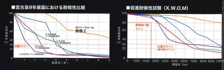 宮古島で9年暴露における耐候性の比較や促進耐候性試験の表を見てわかる通り他の塗料よりも光沢保持率の減っていないことがわかるかと思います。